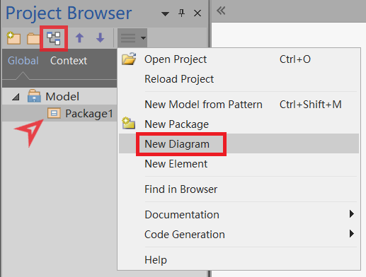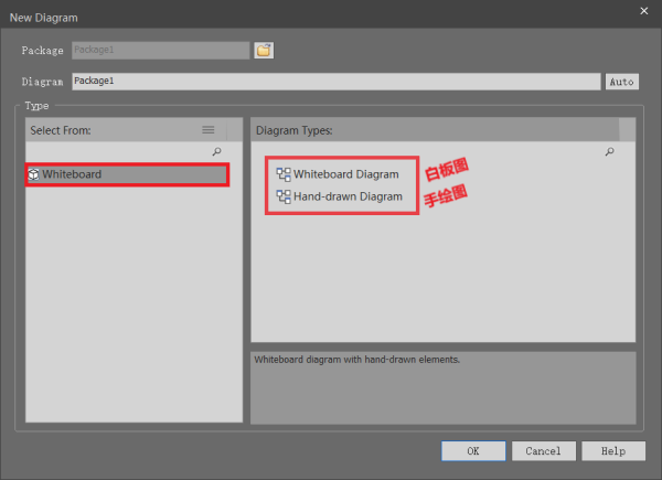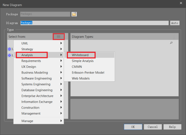 - 打开 New Diagram 窗口(注意:不能在 Root Note 下创建图,需要选择个包后才能创建图)